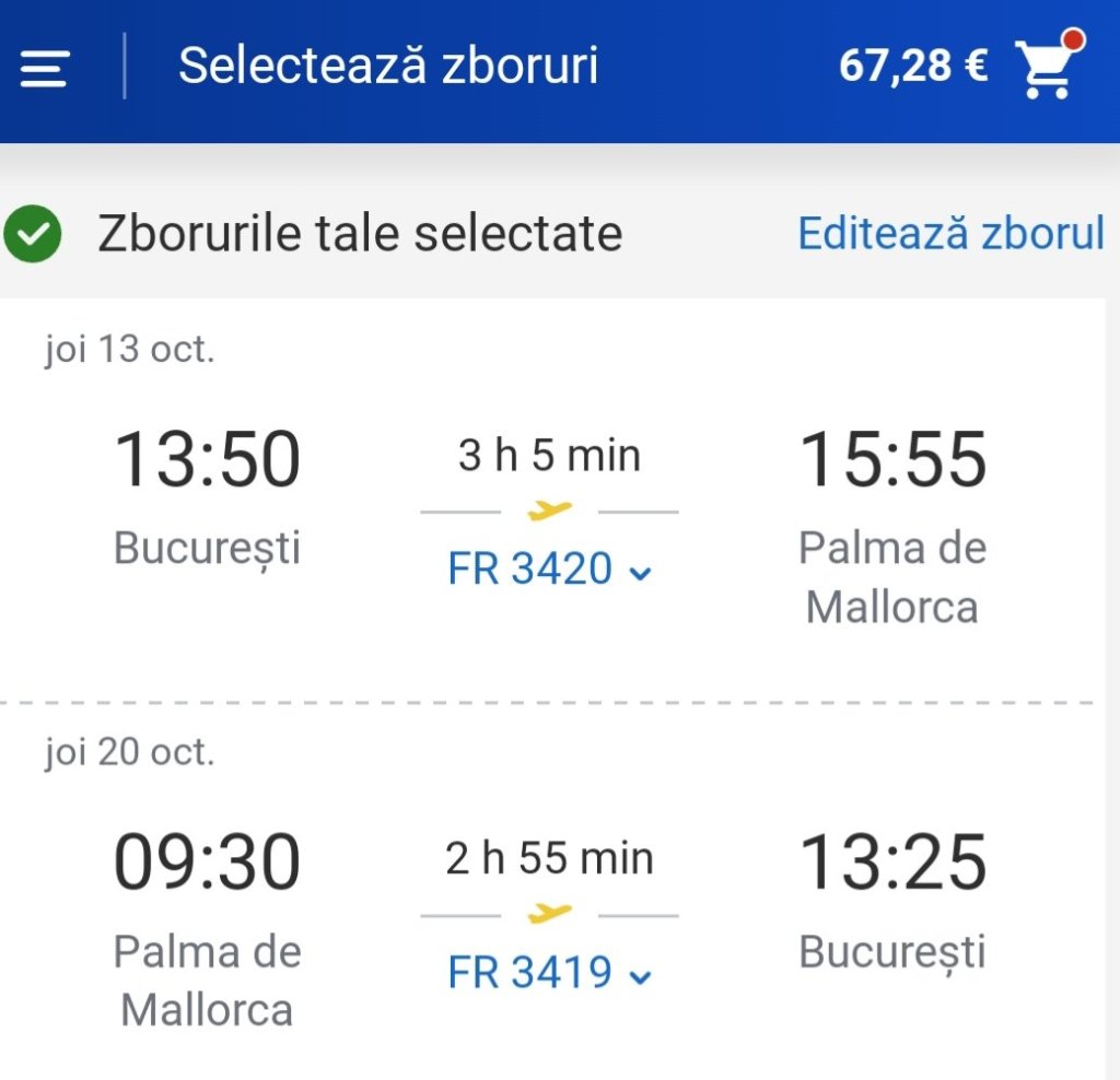 Avion București – Palma de Mallorca 67€/pers.(dus- întors) cu Ryanair.