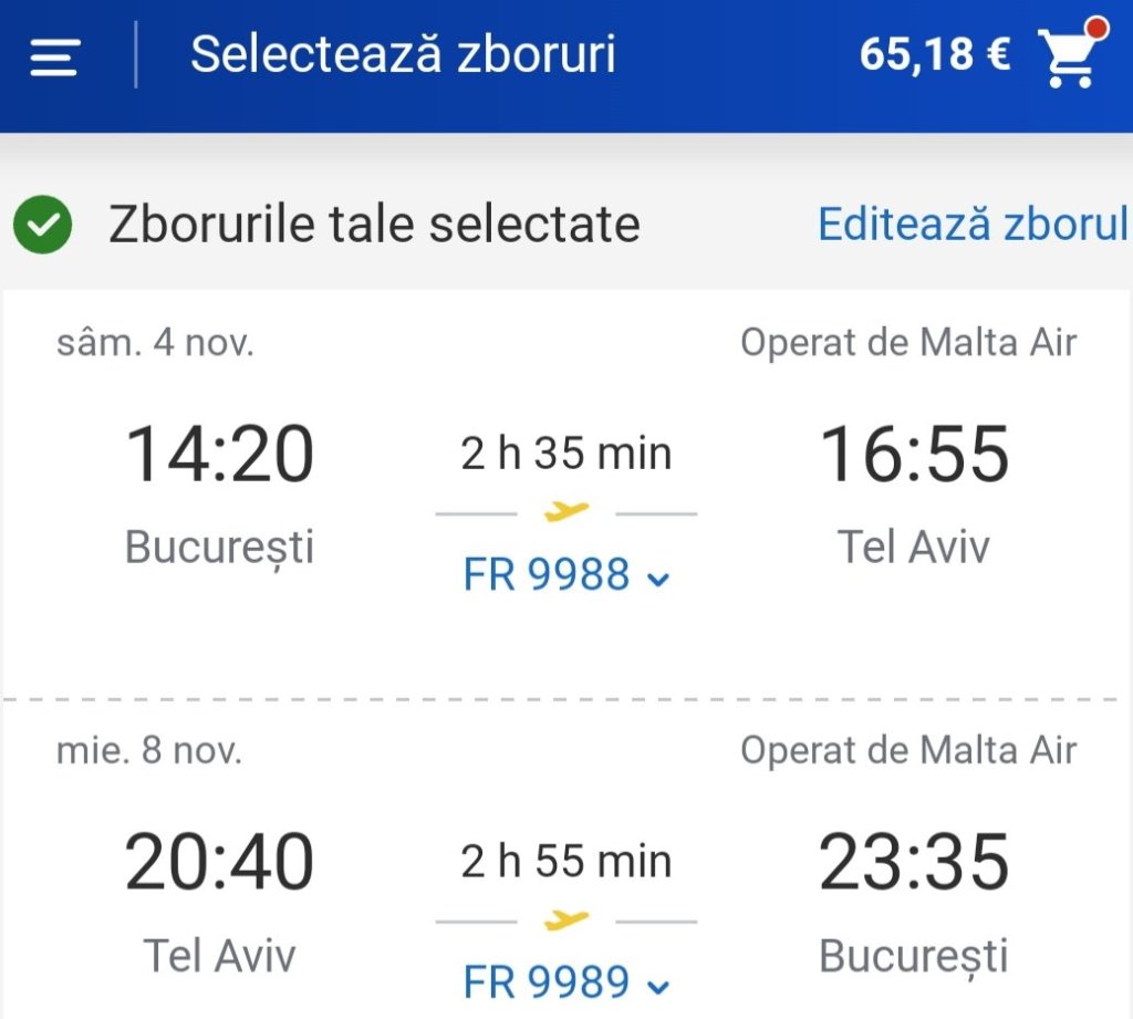 Avion București – Tel Aviv 65€/pers. dus – întors cu Ryanair