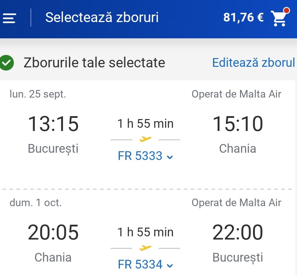 Avion București – Chania 82€/pers. dus – întors cu Ryanair.
