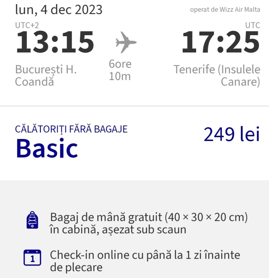 Avion București – Tenerife Sud 111€/pers. dus – întors cu Wizzair