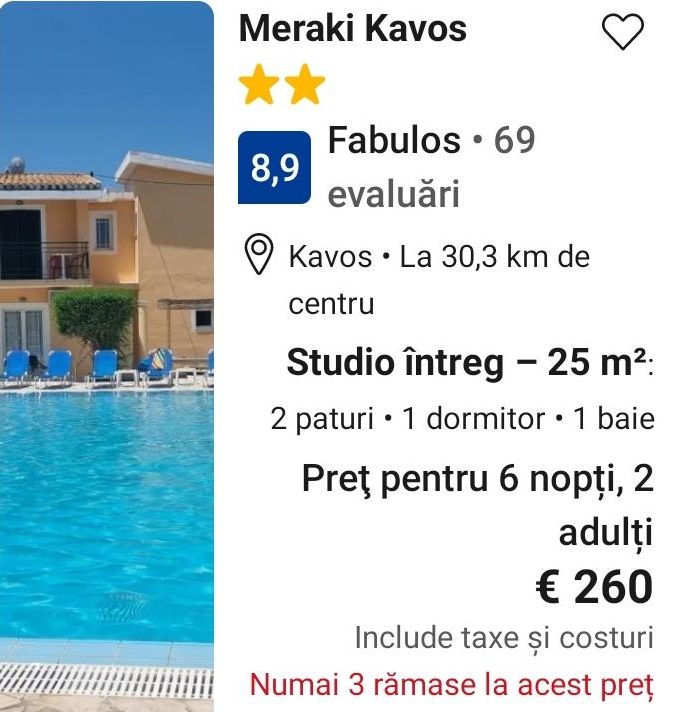 Meraki Kavos 260€/2 pers./6 nopți (130€/pers.) la 3 min. de plajă, cu nota 8,9 pe Booking.com.